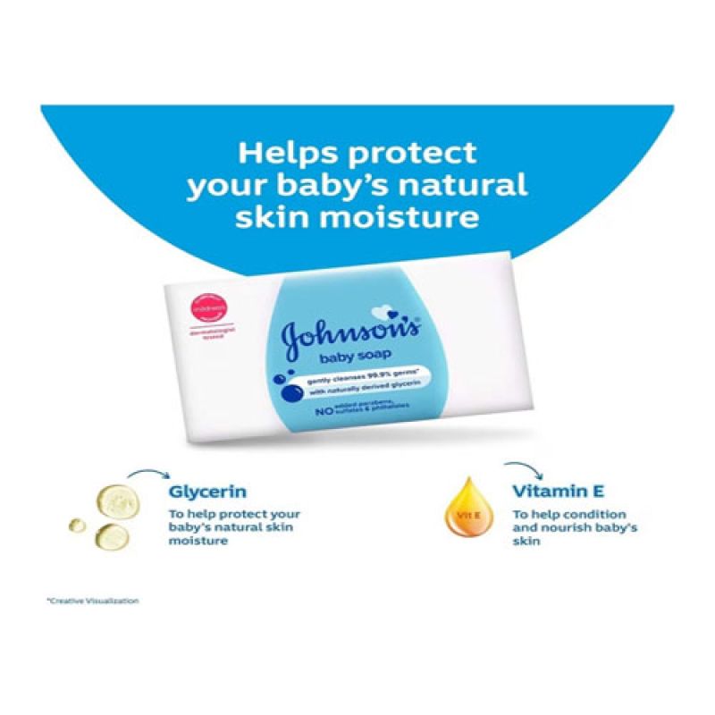 - Give your little one's skin a gentle cleanse with the Johnson's Baby Soap. Formulated with baby-safe ingredients like glycerin and vitamin E, this moisturizing baby soap gently cleanses the baby's delicate skin and protects it from germs. Also, this Johnson's Baby soap is a gentle soap and has a pH-balanced formula to protect the baby's natural skin pH.